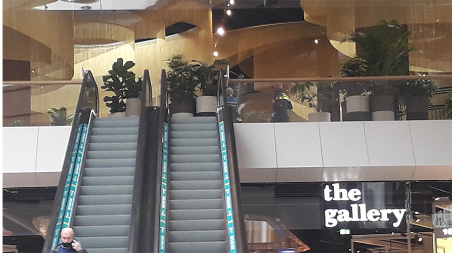 Politieagenten en handhavers die vanmiddag aanwezig waren, zichtbaar bovenaan de rolltrap, grepen niet in