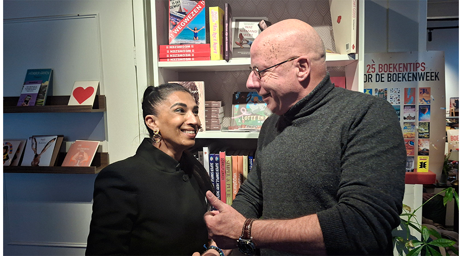 Hans Peter Klazenga en Nita Graafland vanochtend vroeg in boekhandel Chapter in de Wielemakersslop. "Respect voor haar drive en inzet", aldus HP. "Dit is kenmerkend voor een lokale partij",