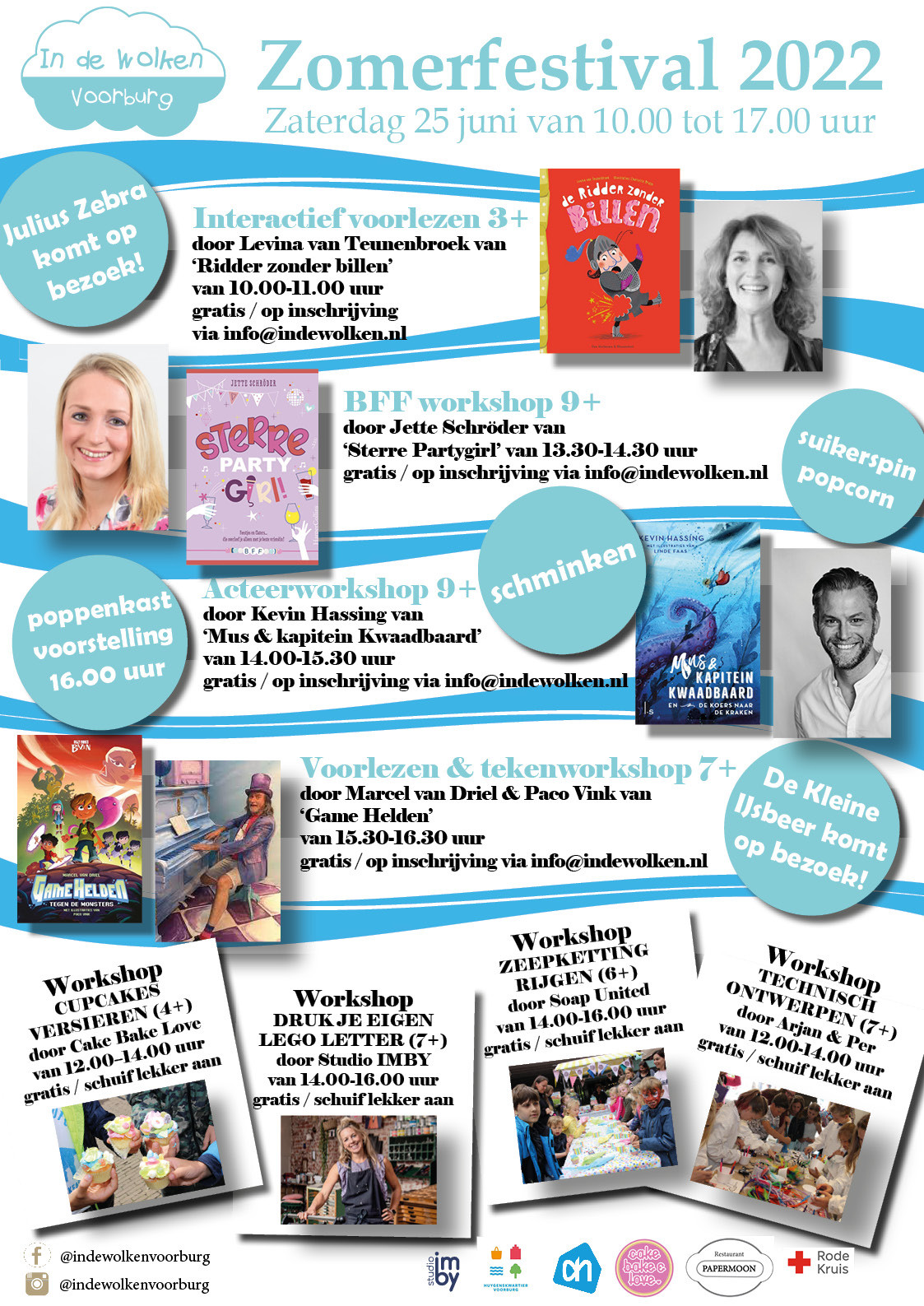 De workshops worden gegeven door lokale ondernemers/kunstenaars. "Onze collega Michel geeft om 16:00 uur een poppenkastvoorstelling en je kunt je tussen 11:00 - 15:00 uur laten schminken. Tussen 14.00 - 16.00 uur komen Julius Zebra en de Kleine IJsbeer op bezoek. Ze delen allebei een verrassing uit en natuurlijk kun je met ze knuffelen en op de foto! Haal tussen 12.00 - 16.00 uur gratis een zakje popcorn of een suikerspin (zolang de voorraad strekt). Alle workshops & activiteiten zijn gratis. Kijk op onze website www.indewolken.nl voor alle info & tijden. Let op: voor de auteursactiviteiten is van tevoren inschrijven verplicht. Dat kan via [email protected] Voor de workshops schuif je gewoon gezellig aan. Tot dan, wij hebben er heel veel zin", aldus de eigenaar van In de Wolken.