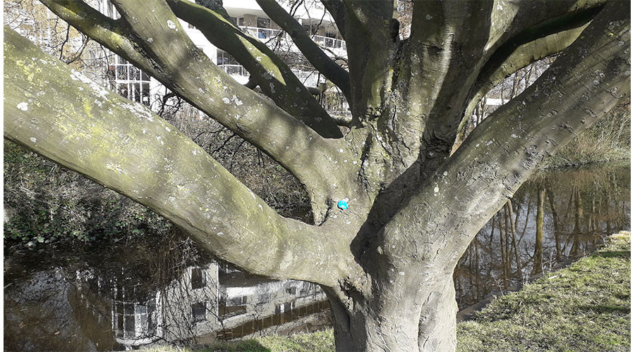Een beschilderde kei in boom vlakbij de Veenkade in Voorburg.