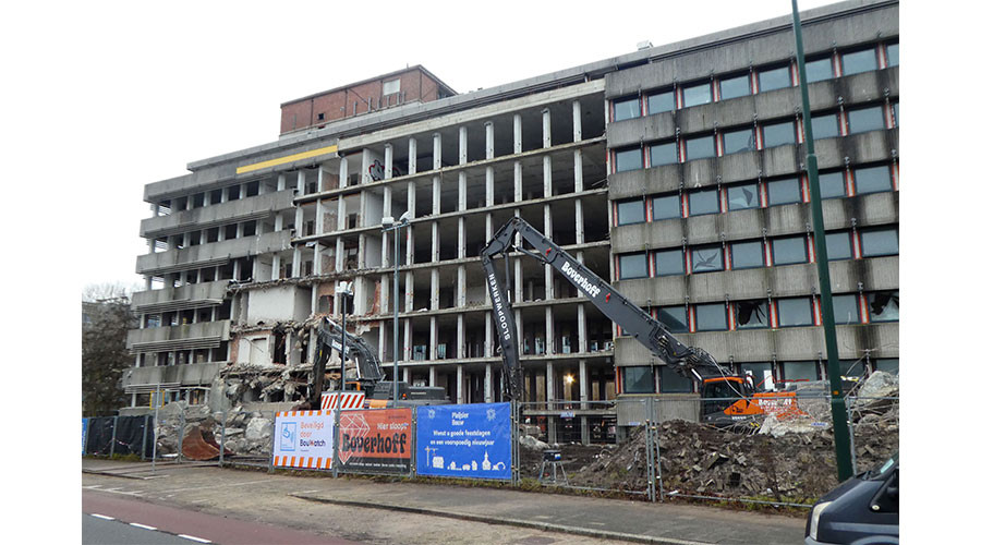 Het Damsigt-gebouw, het voormalige hoofdkantoor van Total, lag er vanochtend zo bij. Nu de sloop van de binnenkant klaar is, vordert het ook al aardig met de buitenkant.