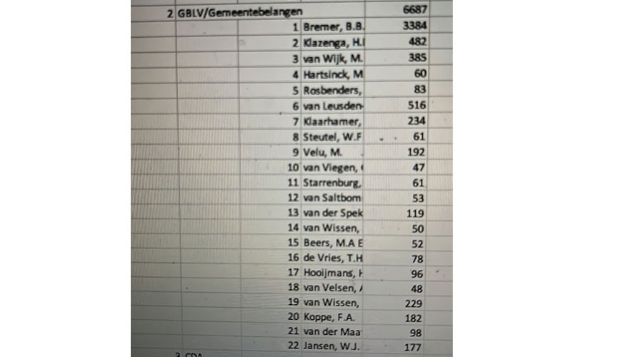 Ed Klaarhamer wordt een nieuwkomer in de raad. Voor Monica Velu (192) wordt het als nummer negen afwachten. Dit heeft er onder andere mee te maken of GBLV een wethouder van deze lijst levert. Opvallend is dat raadsleden als Maurice Hartsinck (60) en oud raadslid Walter Rosbenders (83) laag scoren.