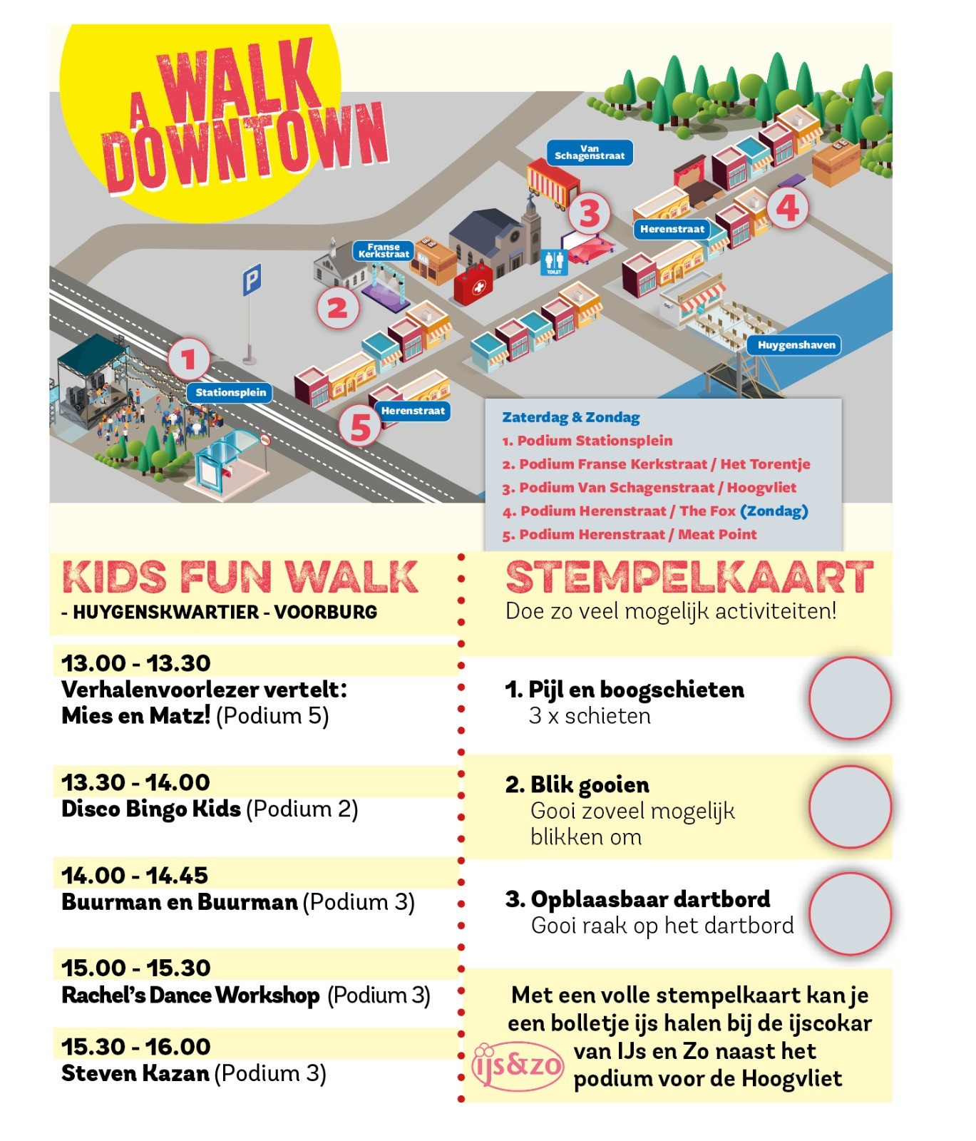 "Vanaf zondagmiddag 2 juni om 13 uur zijn er verschillende optredens en kan je meedoen aan de Kids Fun Walk. Haal een deelnamekaart, doe mee aan de verschillende sportieve activiteiten en win een ijsje van de IJsco-kar van IJS en Zo. Deze kan je vinden het podium voor de Hoogvliet", aldus de organisatie. Op dit grote podium zijn diverse optredens met als grote klappers voorstellingen van Buurman en Buurman on Tour en een magic show van Steven Kazàn, winnaar van de jeugd-Televizierring. Daarnaast is er Disco Bingo voor kids (podium Torentje), een dansworkshop en we beginnen om 13 uur bij het podium voor kinderboekenwinkel in de Wolken (Meatpoint) met een voorstelling van Mies en Matz! Ook zijn er dansworkshops dus het wordt een groot feest. Check de deelname kaart of onze website voor het programma. Voor de moeders, vaders, opa's en oma's is er die dag ook genoeg te doen in het Huygenskwartier, dus kom met de hele familie".